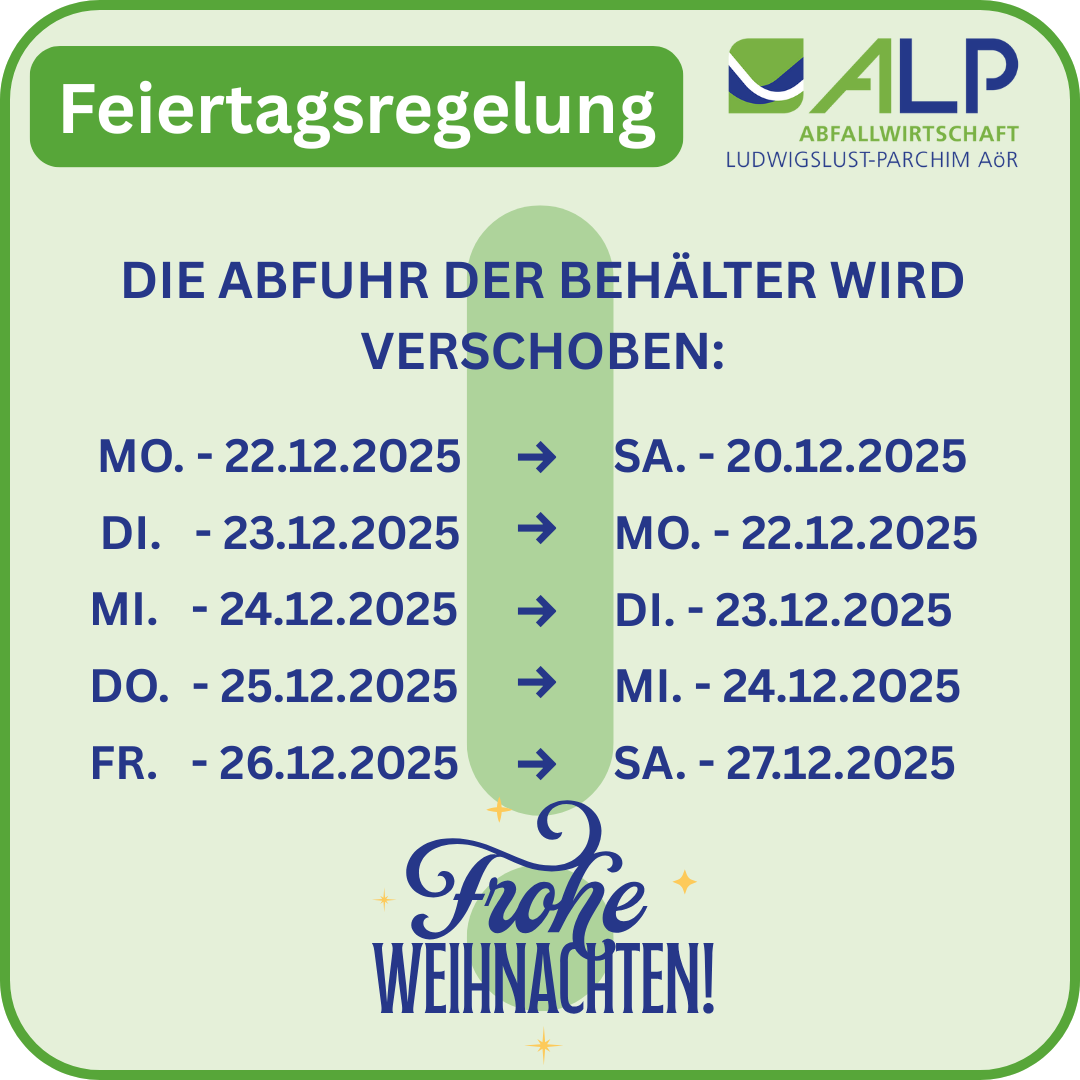In der Weihnachtswoche müssen die Touren vom Montag, Dienstag, Mittwoch und Donnerstag vorgefahren werden! So wird die Montagstour vom 22.12.2025 bereits am Samstag, den 20.12.2025 gefahren! Dies gilt sowohl für die Hausmülltonne als auch für die Altpapier-, Bio- und Gelbe Tonne.
