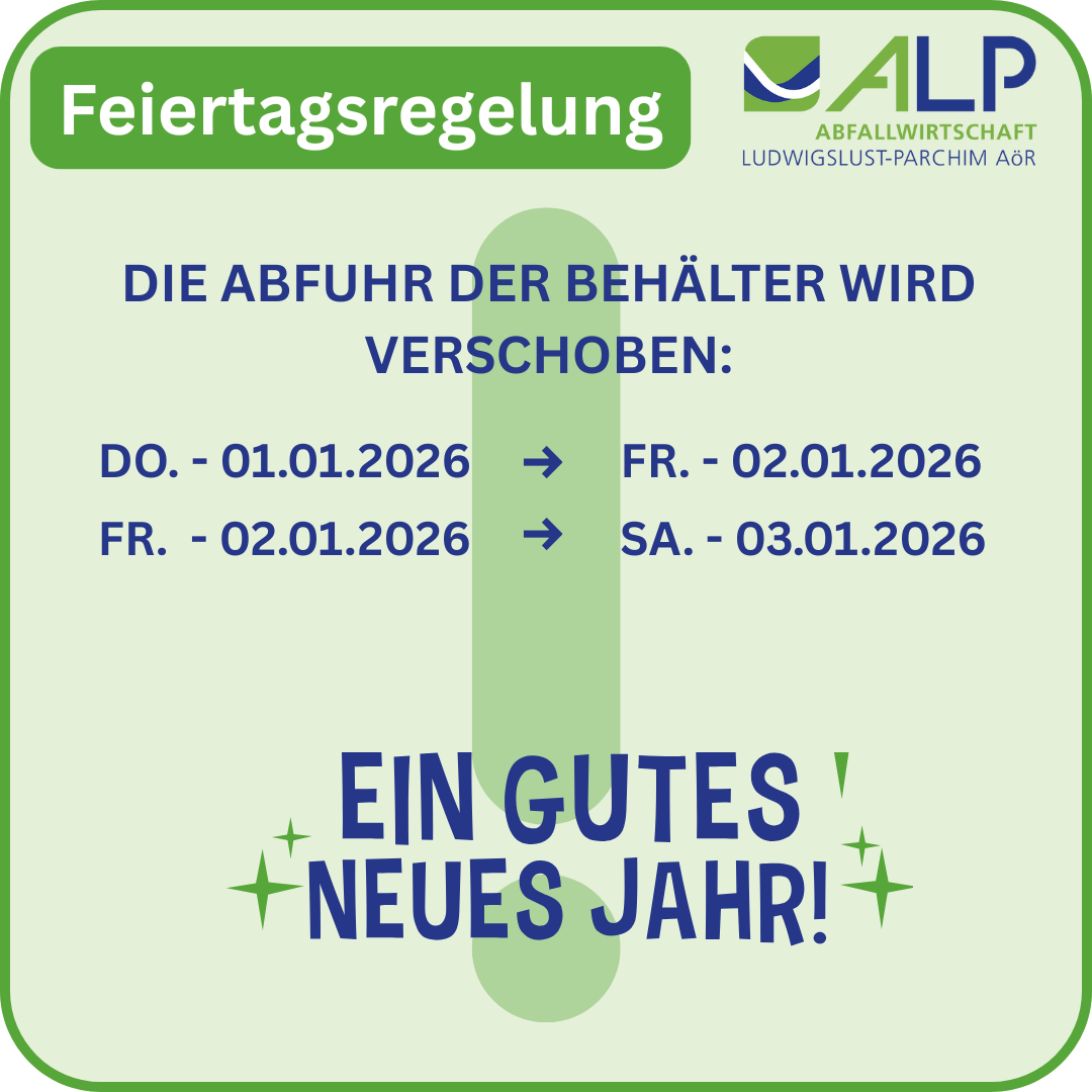 So wird der turnusmäßige Abfuhrtermin vom Donnerstag, den 01.01.2026 am Freitag, den 02.01.2026 nachgefahren!